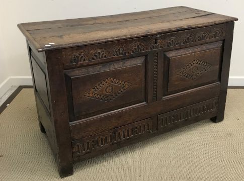 An 18th Century oak mule chest, the boarded cover with cleated ends above a lunette carved frieze and two lozenge carved panels over two drawers, raised on stile supports, 128 cm wide x 57 cm deep x 77 cm high