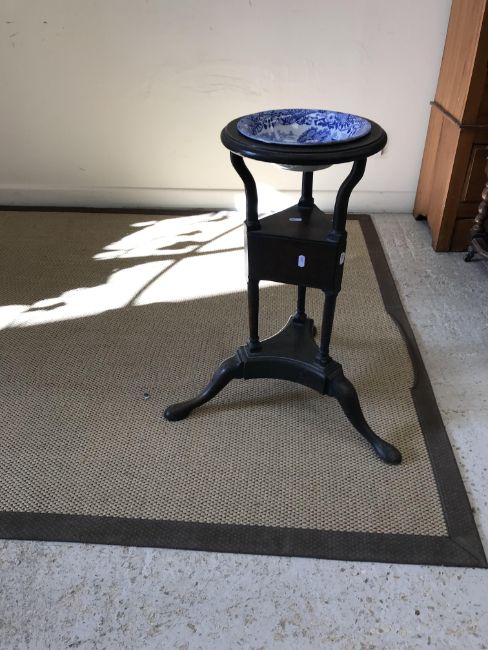 An 18th Century oak washstand, the circular top with later blue transferred Copeland Spode's Italian bowl, above a single drawer on splayed cabriole legs to pad feet,55 cm wide x 66 cm high