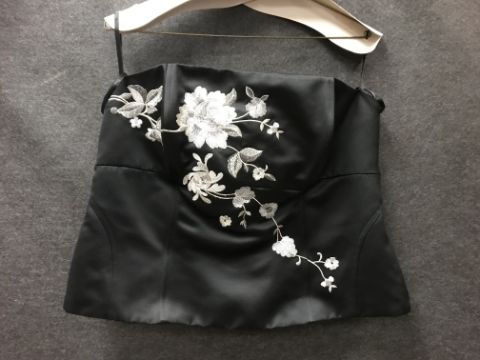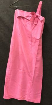A pink silk type strapless gown with boned bodice and cross over front, together with an evening strapless top with silver thread and sequin decoration, size 16