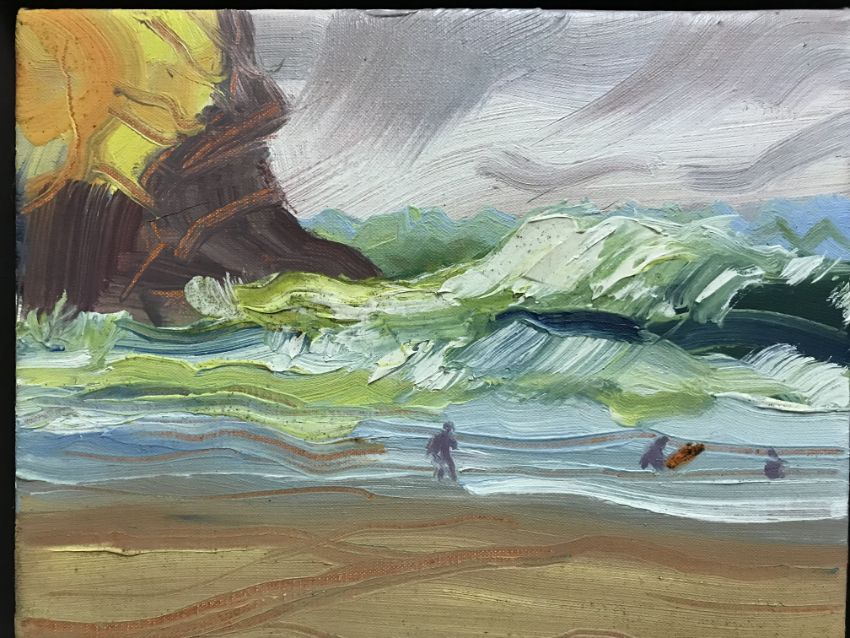 FIONA MCINTYRE "Surfing at Chapel Porth", acrylic on canvas, unsigned, inscribed on label verso, dated "2012", 25.5 cm x 30.5 cm