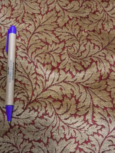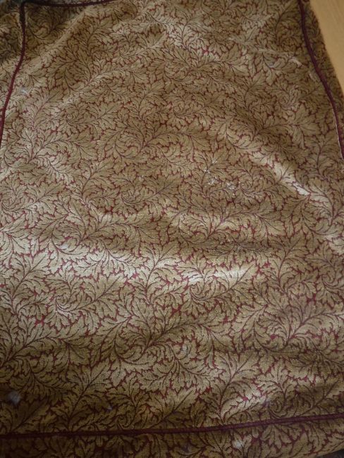 A box containing loose covers for two armchairs, with gold and red acanthus leaf decorated fabric, together with a linen type bed throw