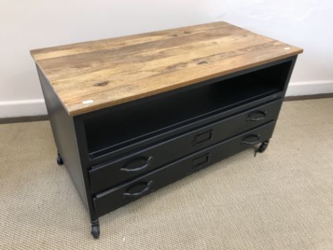 An Ercol elm rectangular coffee table on six baluster turned legs to block feet united by stretchers 113 cm x 49 cm x 41 cm high, a modern oak wake type drop leaf coffee table in the 18th Century manner 121 cm x 96 cm x 45 cm high and a black painted metal TV stand with wooden top over a recess and two drawers on castors 89 cm wide x 45.5 cm deep x 50 cm high
