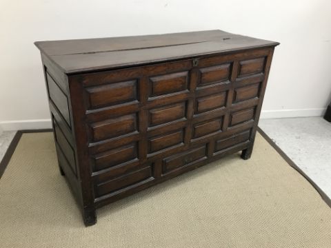 An 18th Century Welsh oak mule chest, the plain rising top with moulded edge, over a fielded panelled front with twelve panels, over three drawers, on stile supports, 145 cm wide x 60 cm deep x 96 cm high