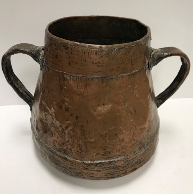 A 19th Century copper two handled water vessel of tapered form with overlaid banding to the top and bottom flanked by hollow work handles, the base of convex form 25.5 cm high x 35 cm wide including handles