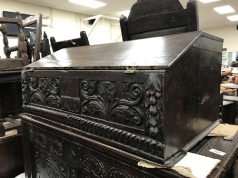 A 18th Century oak Bible box, the plain top above a sloping fall enclosing a single drawer, over a carved front with central initials "AR", flanked by two floral carved panels and fruit carved stiles over rope work and lotus leaf carved slim drawer, 72 cm wide x 46.5 cm deep x 33 cm high