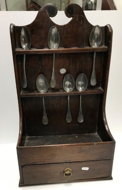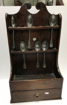 An 18th Century oak spoon rack, the two six section tiers over an open box/recess and single drawer with brass ring handle together with six pewter spoons 34 cm wide x 17 cm deep x 60 cm high