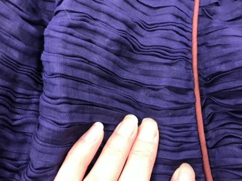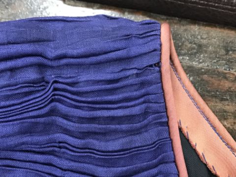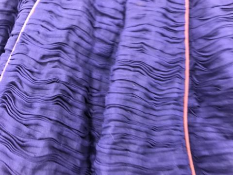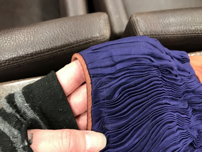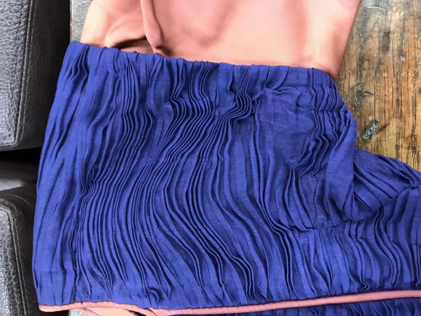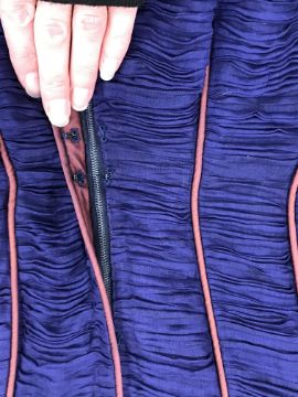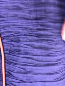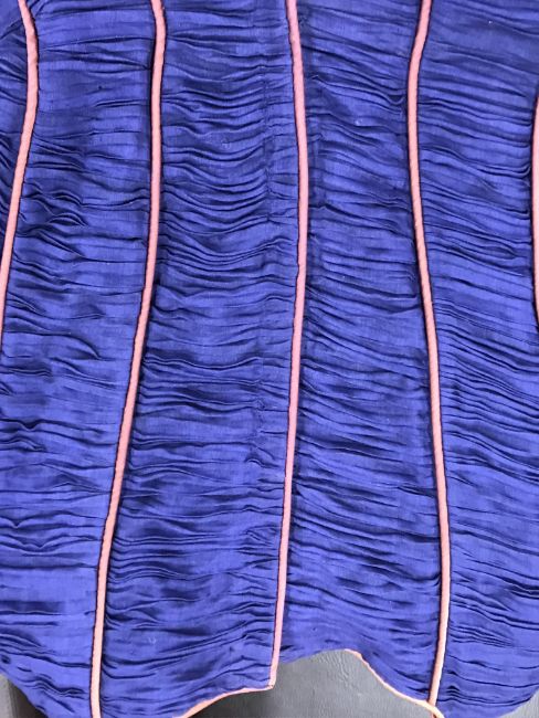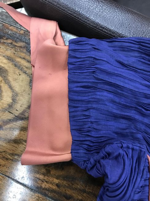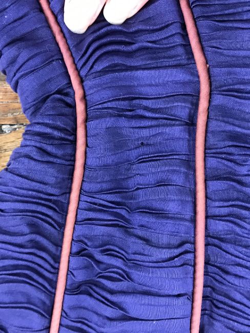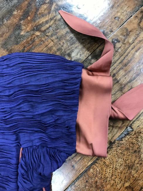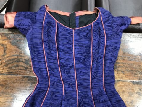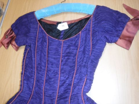A 1960's Sybil Connolly ruched cocktail dress in blue with brown piped decoration and bow trim to arms, bears "Sybil Connolly Dublin" label to interior