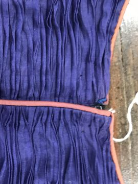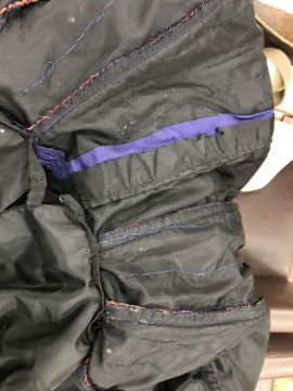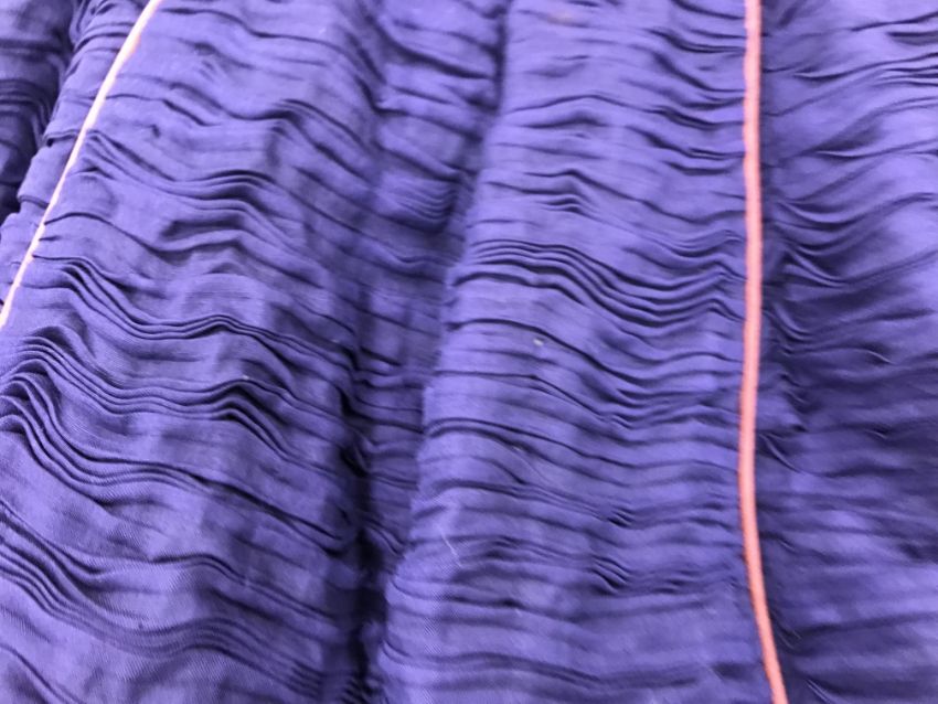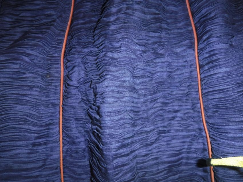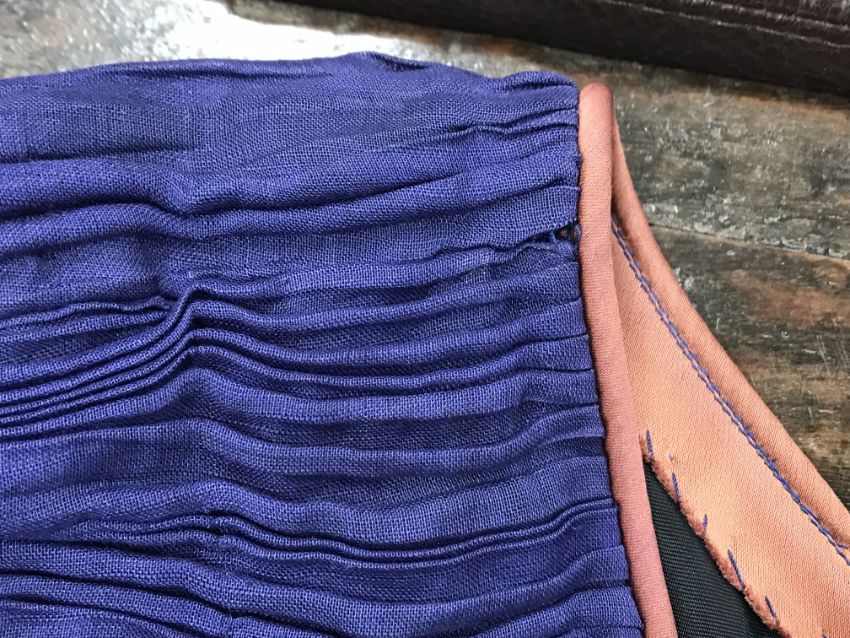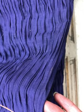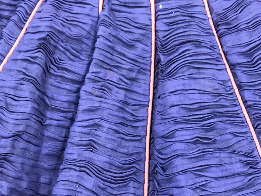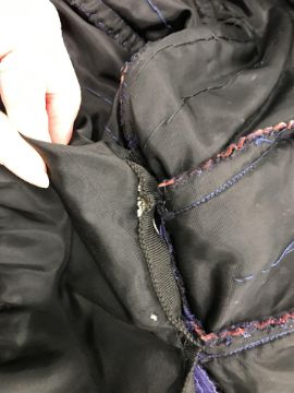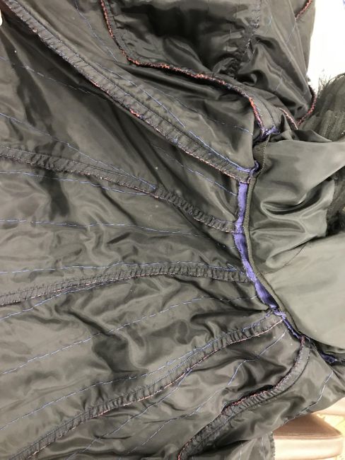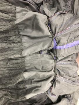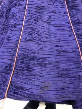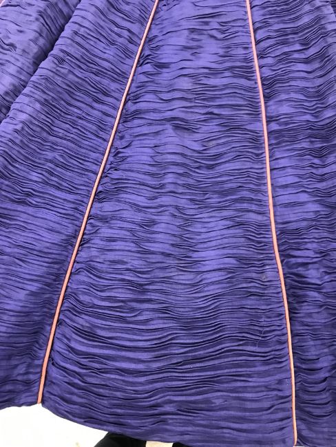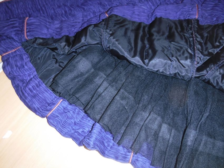 Has areas of staining/discolouration throughout, particularly to the bottom of the skirt. There are some minor holes and pulls. The internal fixed petticoat is coming away in places. Otherwise general wear and tear conducive with age and use, in need of a clean etc - see images for more details