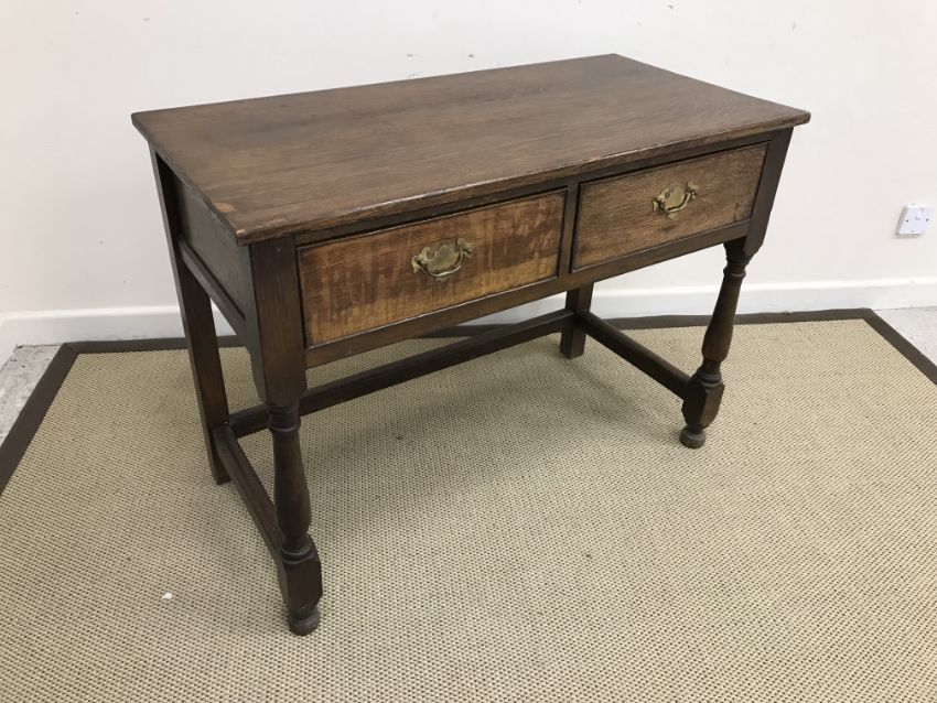 A 20th Century oak two drawer side table in the 18th Century manner, raised on turned legs united by stretchers, 102 cm wide x 51 cm deep x 76 cm high