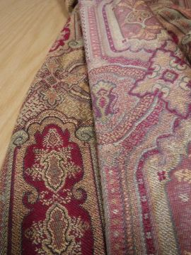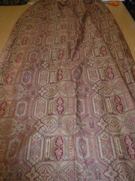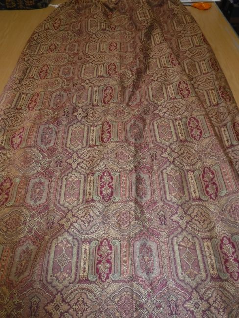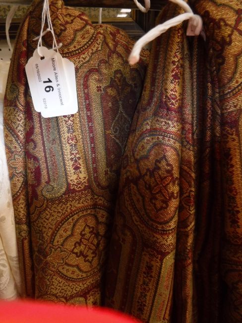 Two pairs of Laura Ashley tapestry weave interlined curtains in burgundy and gold colour way with pencil pleat tape heading, approx 215 cm drop x 190 cm wide at bottom also includes pelmets