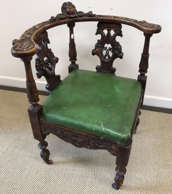 A 19th Century carved walnut corner chair with green upholstered seat, the carved back rail with mask and acanthus decoration, the side supports with twin gryphon decoration, raised on turned and ringed legs to brass caps and china castors, 80 cm high