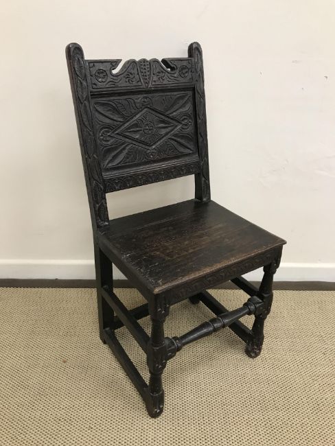 A 17th Century and later oak chair, the lozenge carved back within foliate carved stiles, over a panel seat with lunette carved front rail, on turned legs united by stretchers, 44 cm wide x 93 cm high