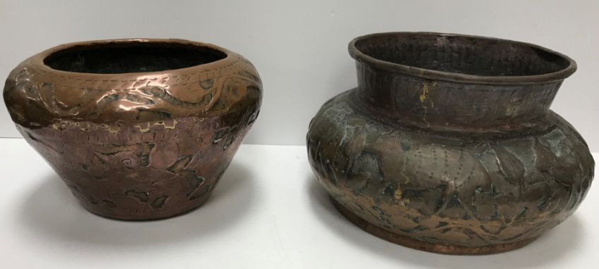 A 19th Century embossed copper vase decorated with exotic animals and birds including camels and deer, 21 cm diameter x 13 cm high, together with a similarly decorated vase with flared rim and bellied main body, 19.5 cm diameter at top x 14.5 cm high