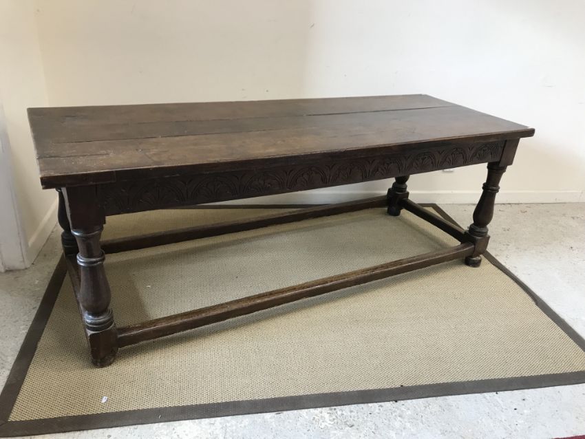 An 18th Century oak refectory style dining table, the three plank top above a lunette carved frieze, on baluster turned supports to block feet united by stretchers, 214 cm long x 76 cm wide x 77 cm high
