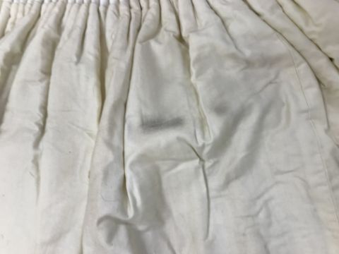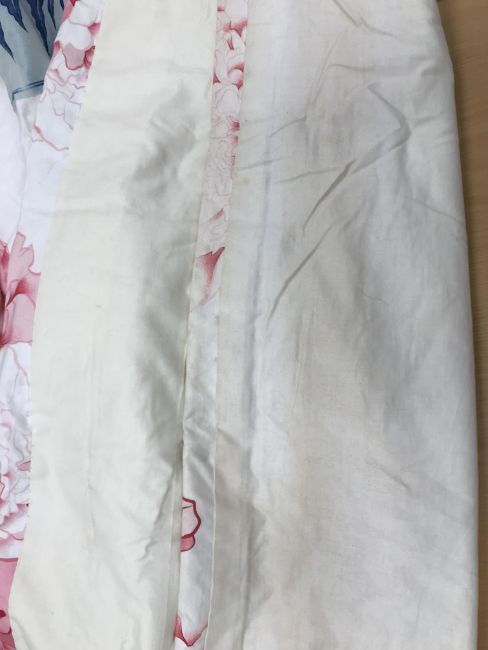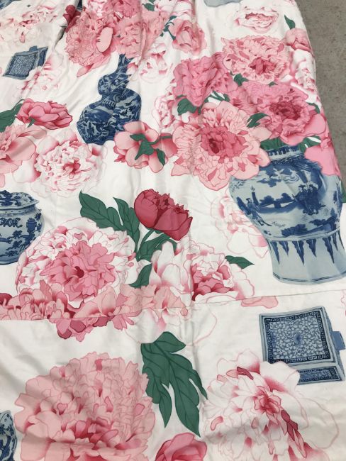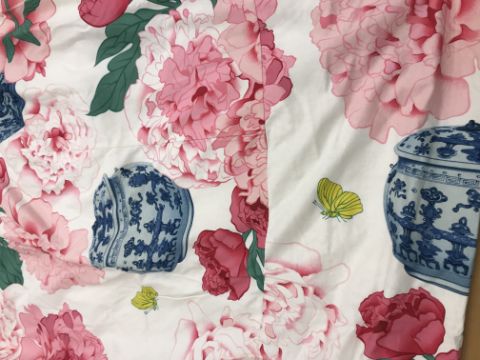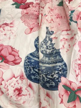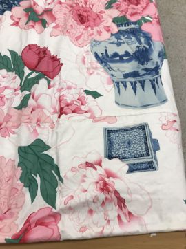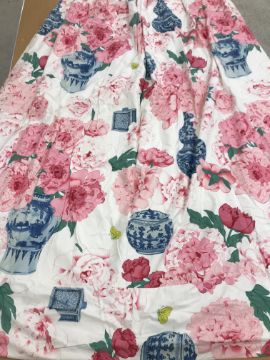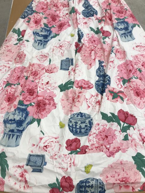 One pair of cotton type curtains with a cream ground and pink, blue and green design of Chinese vases and peonies, interlined, with taped pencil pleat heading, approx 258 cm drop x 207 cm wide at bottom