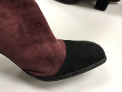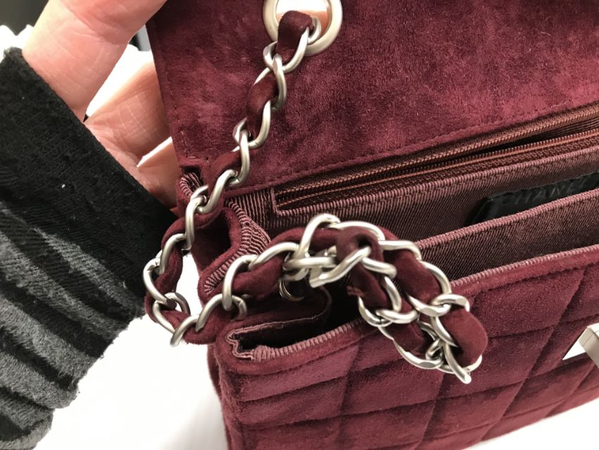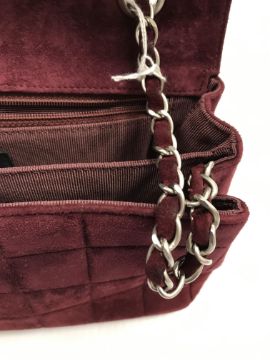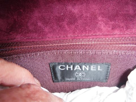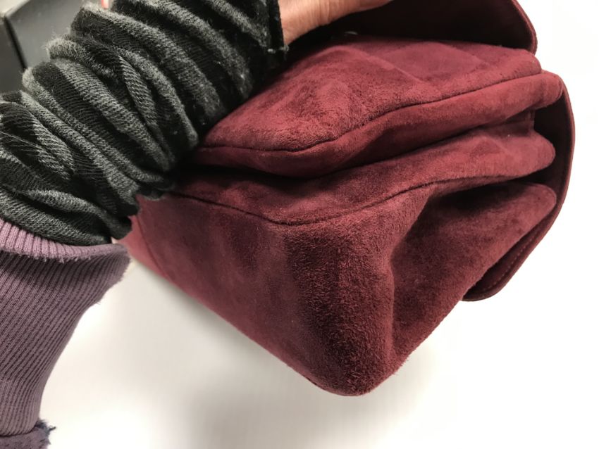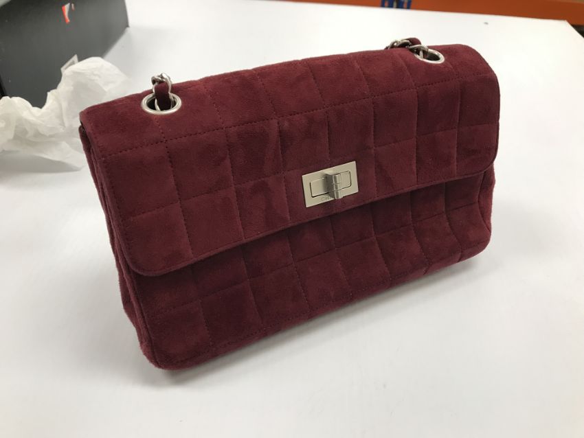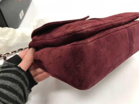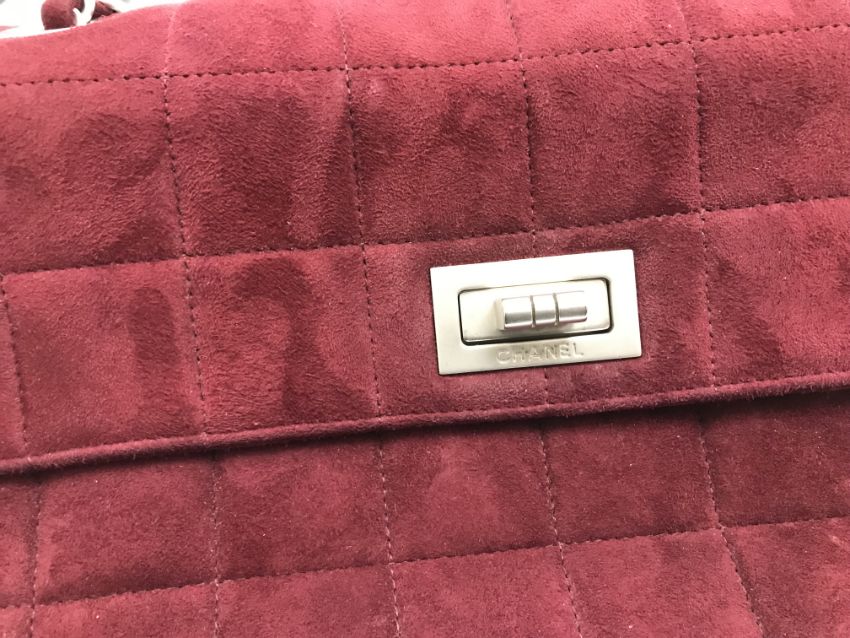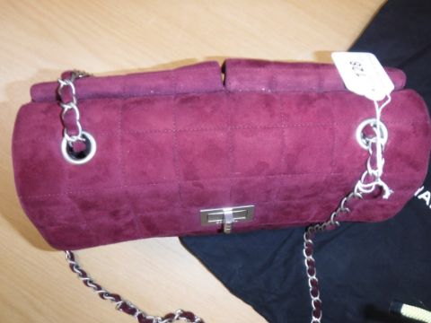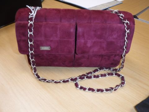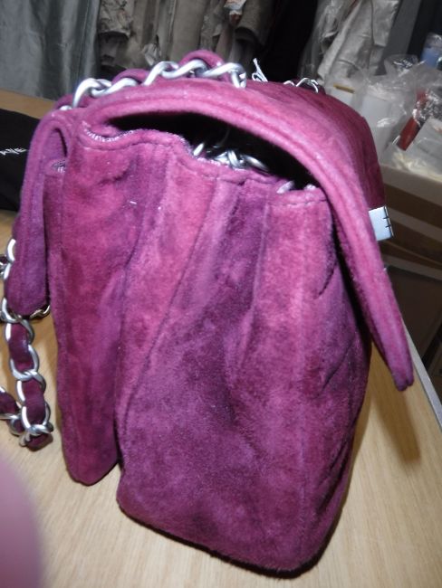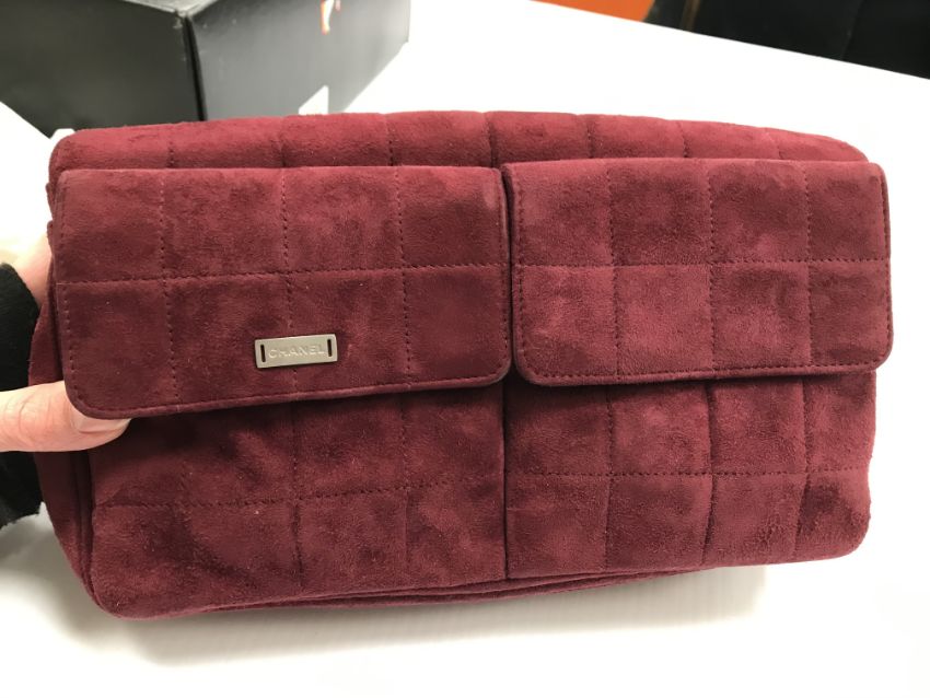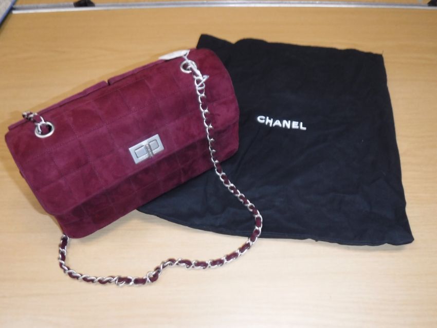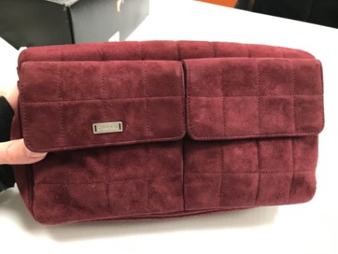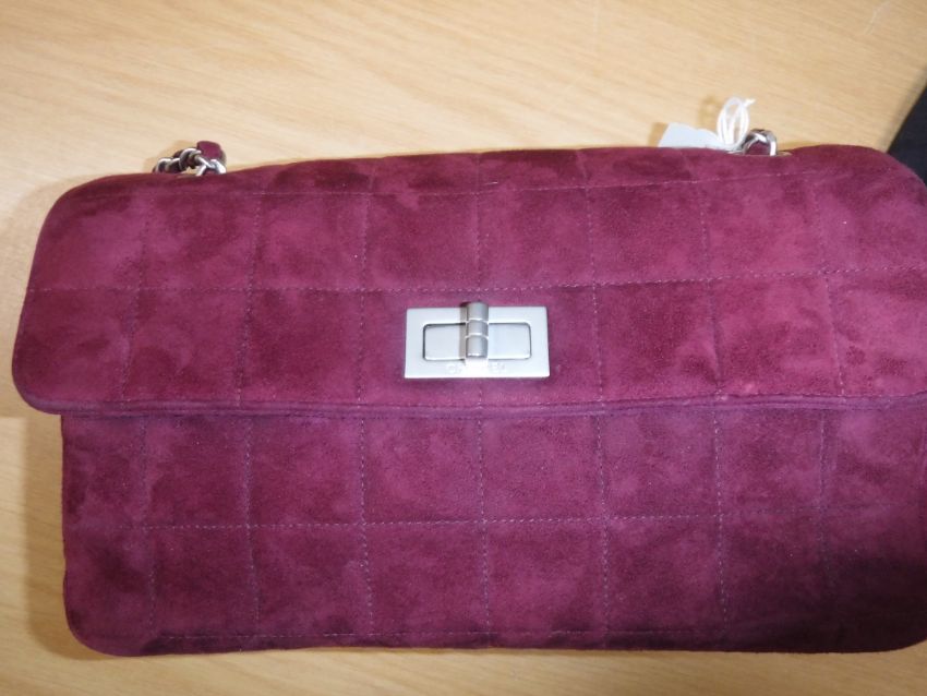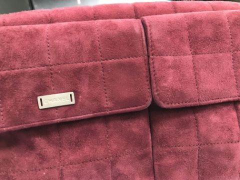 A Chanel raspberry suede square quilted handbag, the lock inscribed "Chanel" with matching interior and No'd 6139448 cross through together with Chanel dust bag and a pair of Chanel suede boots, the main leg in raspberry, toed and heeled in black suede, size 38.5 together with individual dust bag and shoe box