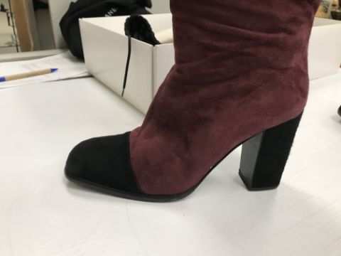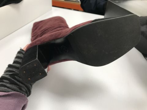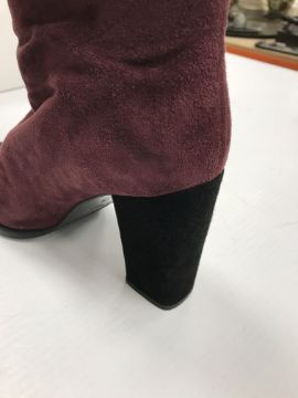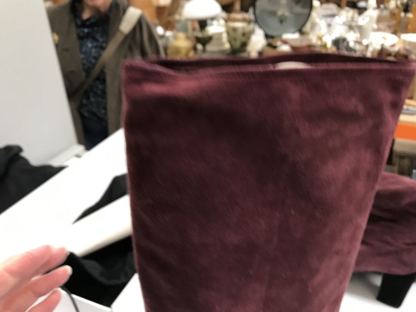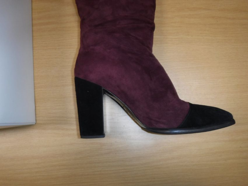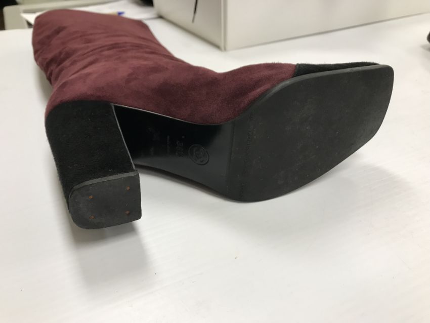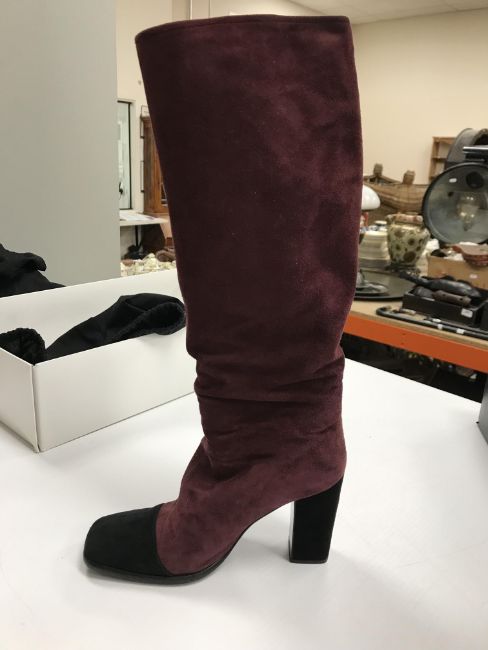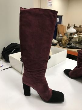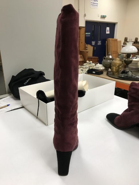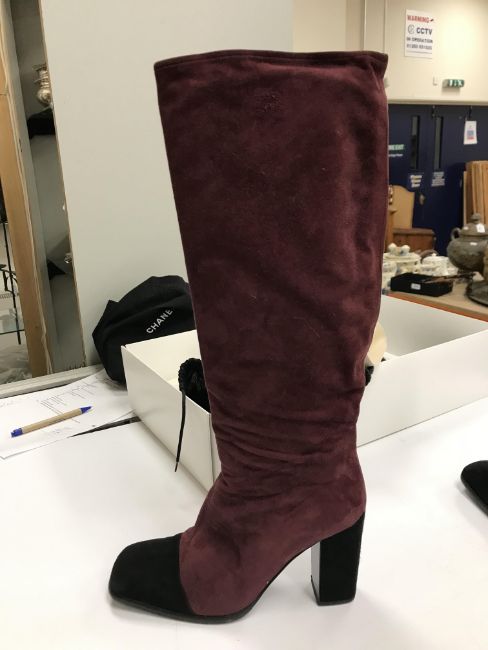 The handbag has some wear and tear conducive with age and use particularly to the two back pockets. There is some loss to the suede on the corners of the flaps through rubbing as well as some marks/brushing to the suede. There is wear to the suede on the strap in line with use. Otherwise general wear and tear to include some surface scratches, tarnishing etc to the metalwork and general wear to the fabric throughout. The boots have got marks on the inside heels. Otherwise some light wear and tear to the soles. Generally in good condition. The box has rips and some damage