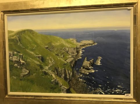 CHARLES SIMPSON (B. 1952) "Cruise ship", coastal landscape with cruise ship in background, oil on canvas, signed lower left, bears "Jonathan Davies" label verso, 60 cm x 90 cm (ARR)