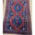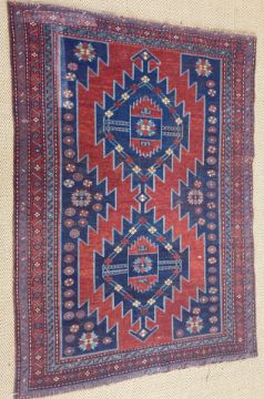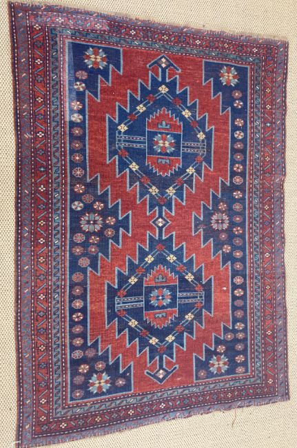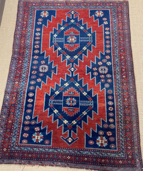 A Caucasian rug, the central panel set with two diamond shaped medallions on a red and blue ground with stylised flower head design within a stepped red and blue geometric patterned border approx. 156 cm x 109 cm