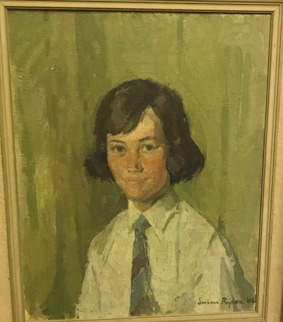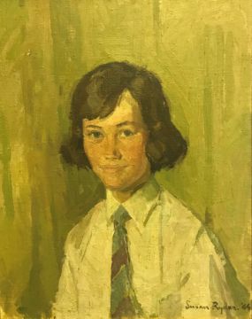 SUSAN RYDER "Sally d'Agrain nee Alexander", a head and shoulders study of a young girl in white shirt with Pony Club tie, signed and dated '64 lower right, 50 cm x 40 cm
