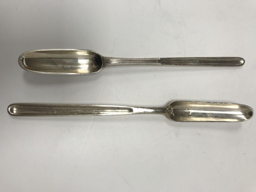 A Georgian silver marrow scoop (by John Lambe, London 1778) and a further Georgian silver marrow scoop (by Peter and William Bateman, London 1808), 2.9 oz
