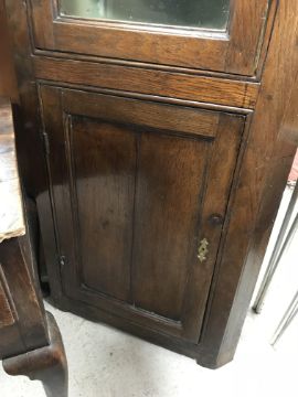 A 19th Century oak free-standing corner cupboard, the moulded cornice over an arched glazed panelled door enclosing a painted interior with three shelves, over a plain panelled door, 75 cm wide x 186 cm high