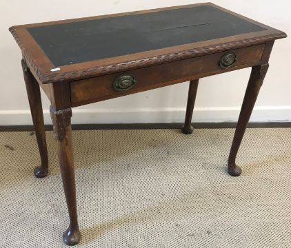 An 18th Century and later walnut single drawer side table, the plain top with leatherette insert with carved edge, over a single drawer with brass handles, raised on acanthus capped cabriole legs to pad feet, 90 cm wide x 48 cm deep x 71 cm high