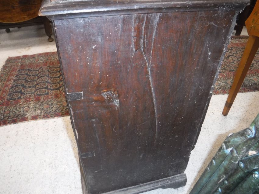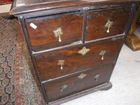An 18th Century elm chest of drawers, the plain top above two short over two long drawers, with brass drop handles, raised on bracket feet, 56.5 cm wide x 41 cm deep x 72.5 cm high
