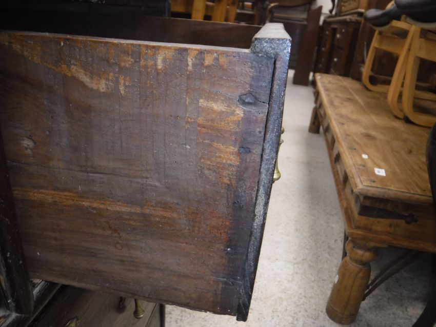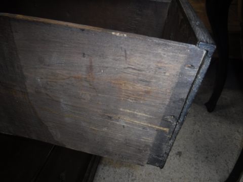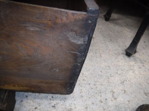 Top with various splits. Side panels also with splits. Back panels with splits top left. Rear left foot missing. Please note drawers are not dove-tailed but nailed. See images for further detail.