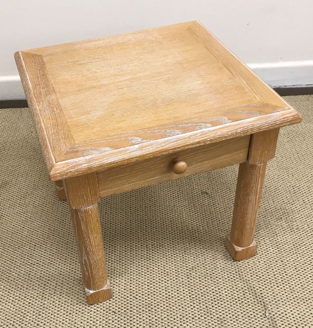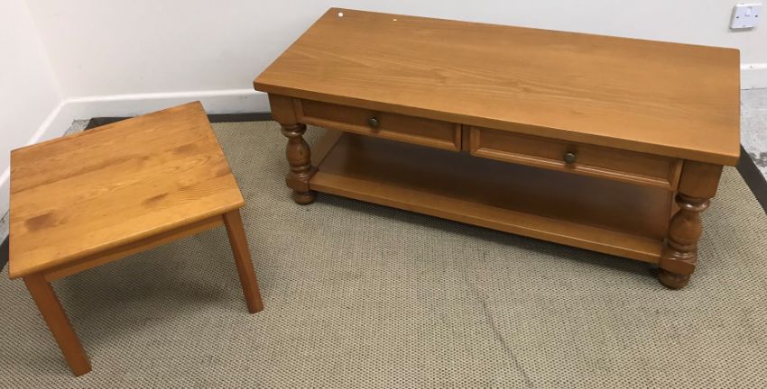 A modern cherry wood coffee table, the plain top above two drawers on turned legs united by an under tier 120 cm x 50 cm x 45.5 cm, a limed oak single drawer side table 50 cm square x 45 cm high and a small pitch pine occasional table