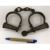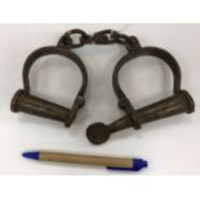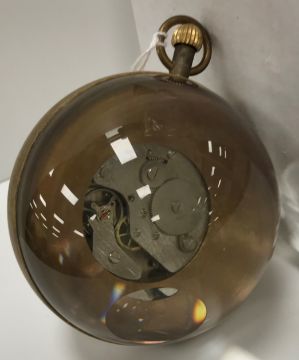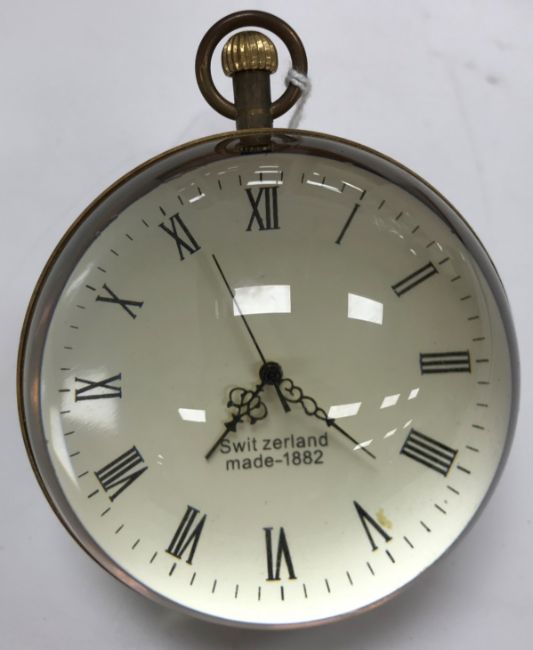 A modern glass ball style watch, the enamel dial set with Roman numerals and inscribed "Switzerland Made 1882", 8 cm long together with a pair of vintage style metal decorative handcuffs