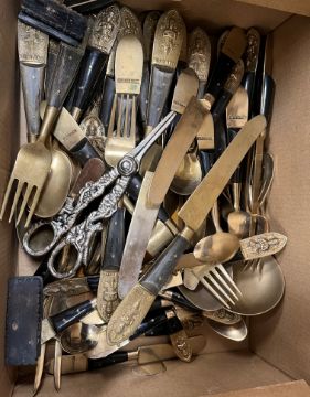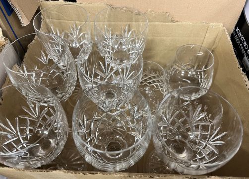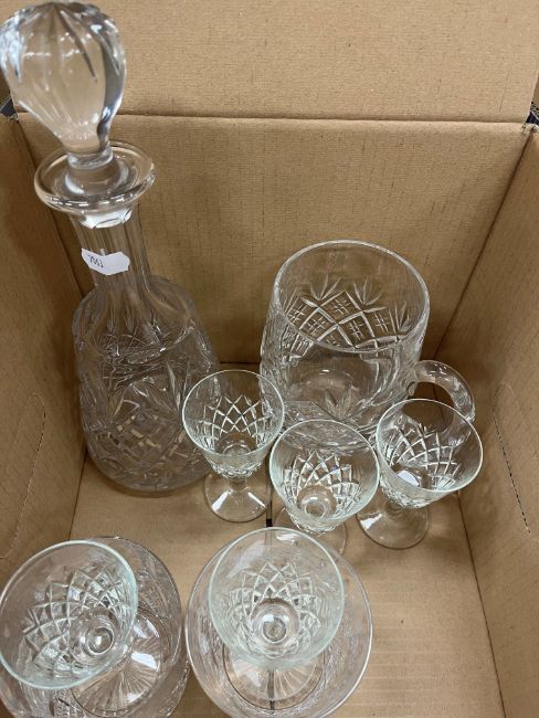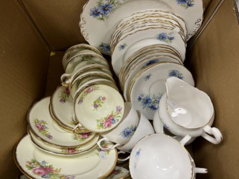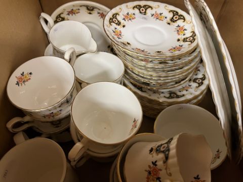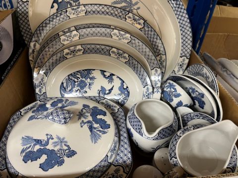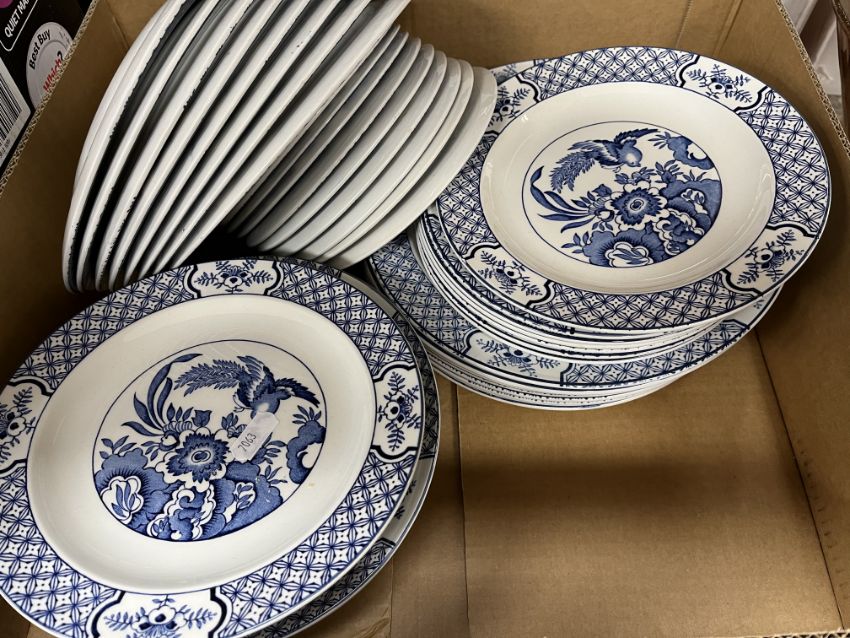 A Wood & Son "Yuan" patter blue and white dinner set, Royal Stafford "Balmoral" pattern tea service, Colclough blue floral decorated tea service, various cut glassware, mallet-shaped decanter, Singapore "Starbronze" cutlery set, etc and a collection of decorative pictures