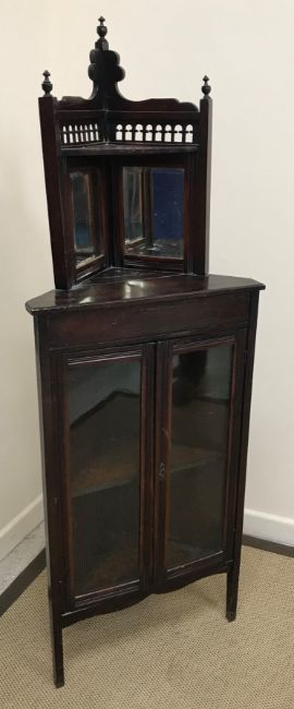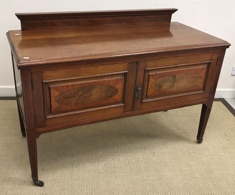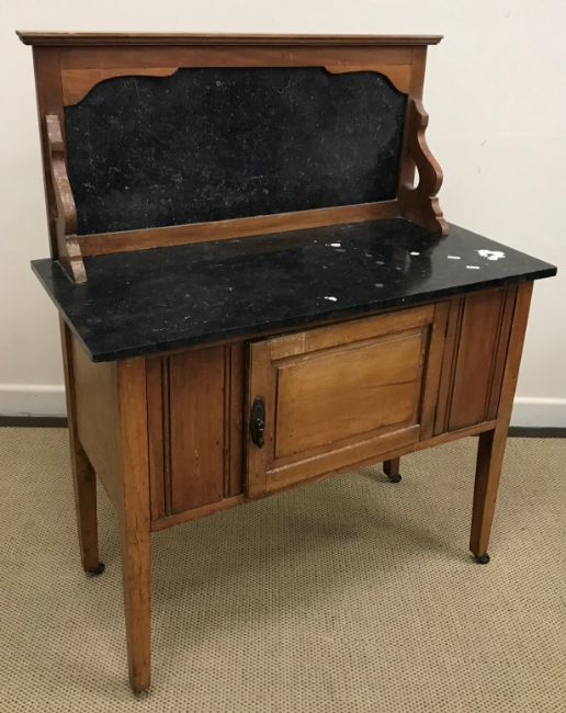 A circa 1900 oak student's bureau with fall front over two shelves 65 cm wide x 124 cm high x 30 cm deep together with an Edwardian mahogany and inlaid washstand with two cupboard doors on square tapering legs 122 cm x 86 cm x 53 cm deep, an Edwardian mahogany mirrored back two door corner cupboard 59 cm wide x 164 cm high x 37 cm deep and an Edwardian mahogany marble topped and marble backed washstand 92 cm wide x 115 cm high x 43.5 cm deep