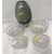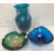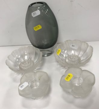 A modern pale blue frosted glass fruit bowl with red lined border and small medallion decoration 38.5 cm diameter x 9 cm high, two Dartington Crystal vases (boxed) and a Scandinavian Art Glass smokey vase 17.6 cm high, two Scandinavian Art Glass bowls approx. 16 cm diameter, a flower head glass candle stand and two French Cristal flower head candleholders 9 cm diameter and a blue and copper lustre speckled glass vase 23.5 cm high