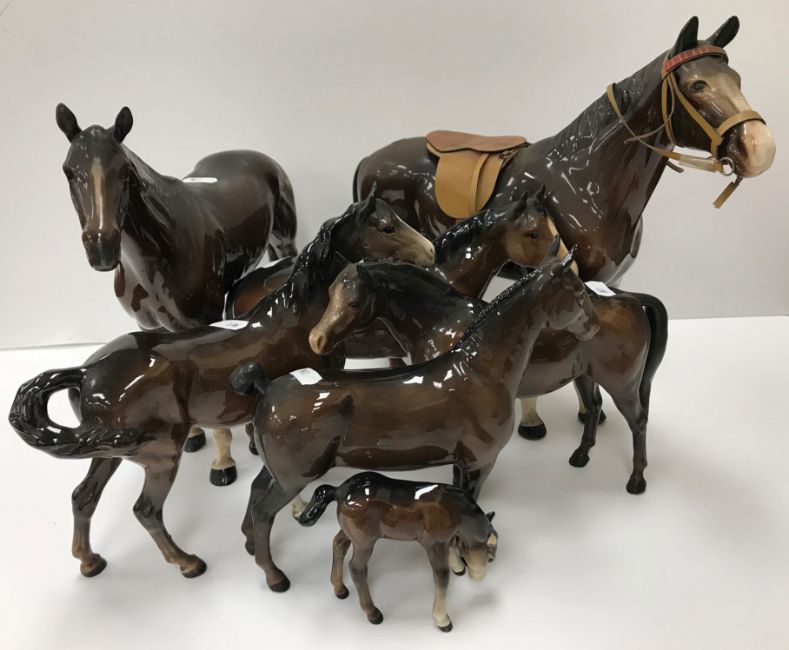 Six Beswick horse figures, tallest 30.5 cm high, shortest 19.6 cm high together with similar figure of a feeding foal (ear very damaged) 8.8 cm high