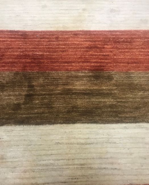 A modern striped rug in terracotta, brown and cream colours 204 cm x 250 cm