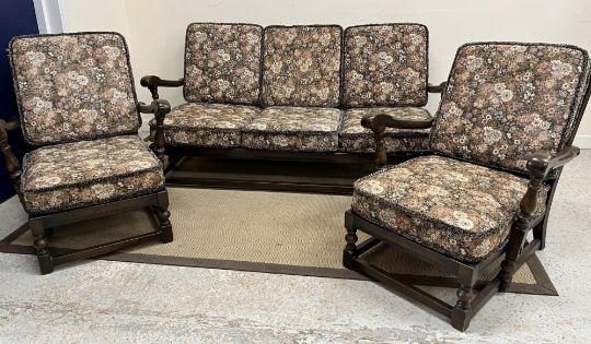 An Ercol elm framed three piece cottage living room suite comprising sofa and two armchairs 160 cm wide x 90 cm deep x 82 cm high (sofa)
