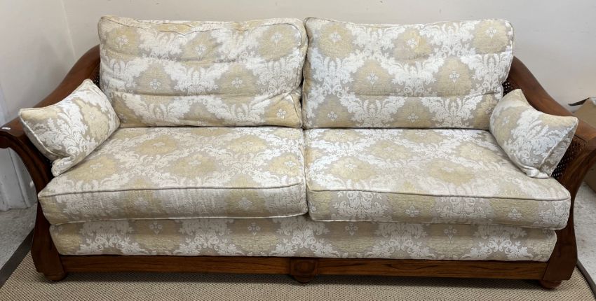 A Multiyork three piece walnut framed lounge suite comprising two two seat sofas and matching armchair with scroll arms and bergere double caned sunburst sides on turned feet 215 cm wide x 90 cm deep x 83 cm high
