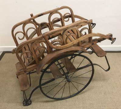 A Victorian style child's oak two seat buggy with bentwood side panel decoration, the seats folding / adaptable as inward or outward facing, with folding handles, raised on a single axle with two spoked wheels, 58 cm wide x approx 136 cm long x 87 cm high