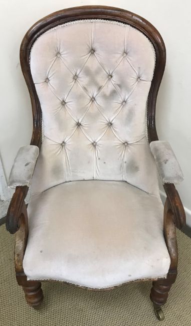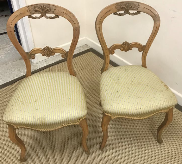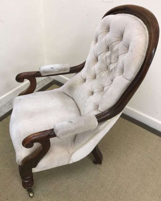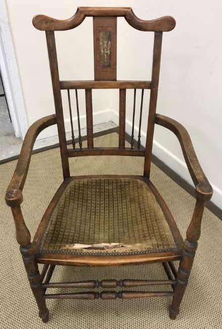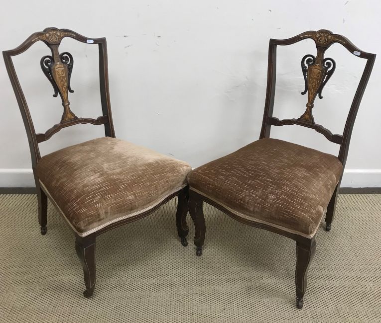 A Victorian mahogany rectangular pedestal occasional table 42 cm x 52 cm x 73.5 cm high, a Victorian mahogany framed button back open arm salon chair, a 19th Century ash rush seat ladder back elbow chair, Edwardian mahogany and stained beech elbow chair, two similar mahogany and inlaid salon chairs and two Victorian balloon back chairs