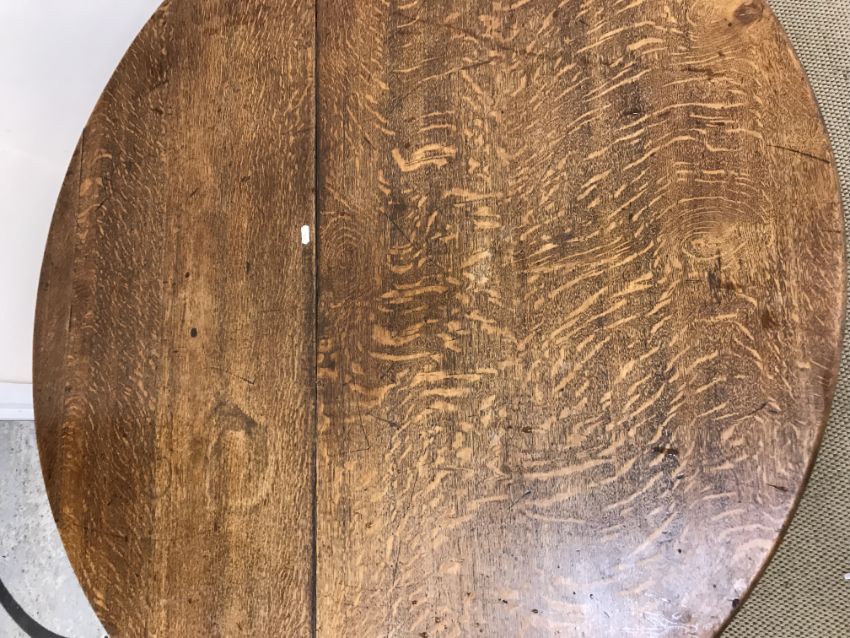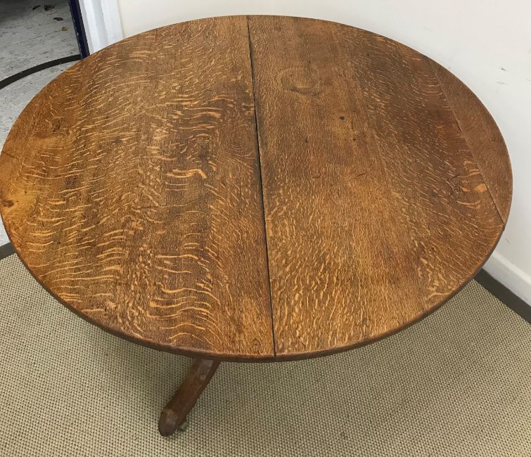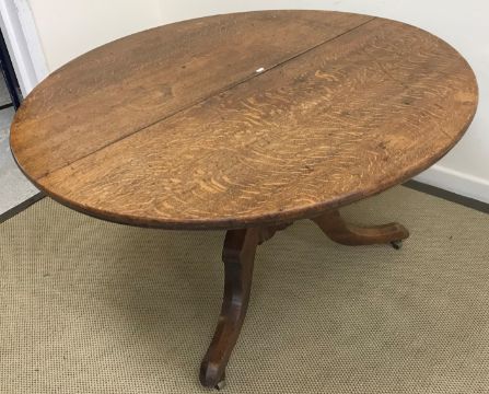 A Victorian oak breakfast table, the circular snap top on a turned and ringed pedestal to hipped splayed tripod base and castors, 122 cm diameter x 71 cm high