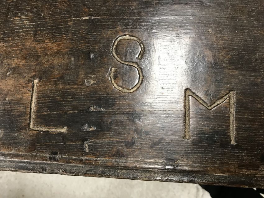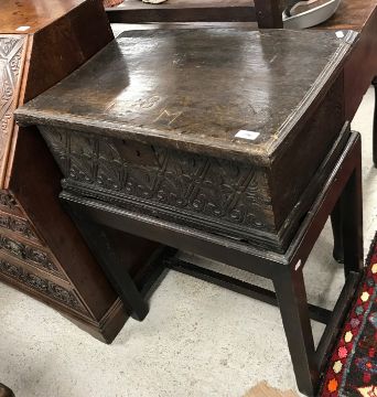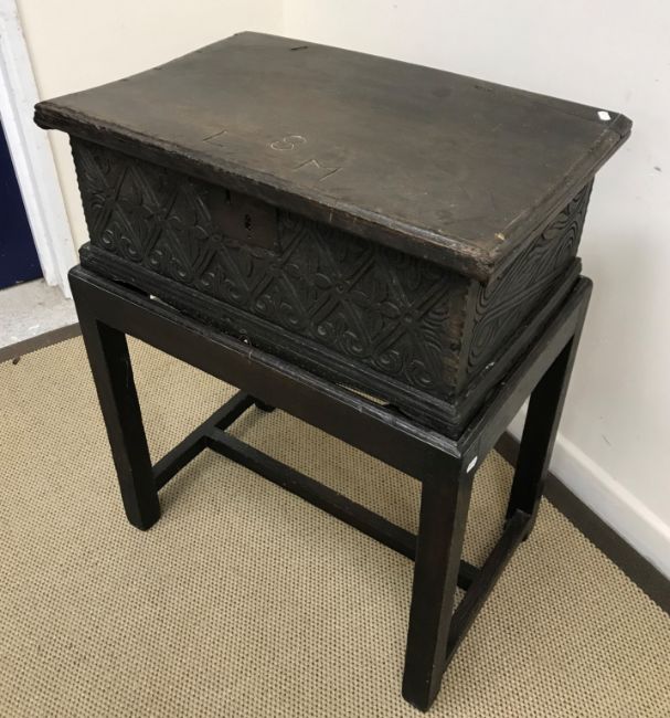 A 17th Century oak Bible box, the plain top with moulded edge inscribed "LSM", opening to reveal a plain interior with later paper lining, the front panel with guilloche style and foliate carving, flanked by similarly decorated sides, on a later stand of square supports united by a centre stretcher, overall size 67 cm wide x 43 cm deep x 86 cm high