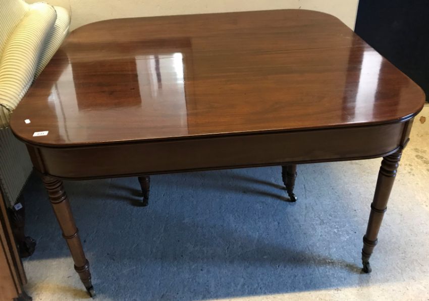 A Regency mahogany rounded rectangular extending dining table, the plain top with reeded edge, over a plain frieze and concertina action, with two extra leaves, on turned and ringed tapering legs to brass caps and castors (Provenance: Hare's Antiques Cirencester), 236 cm long max x 131 cm wide x 74.5 cm high