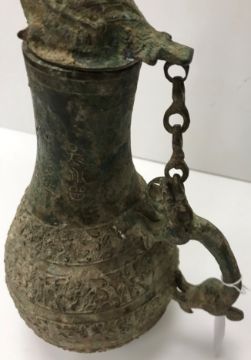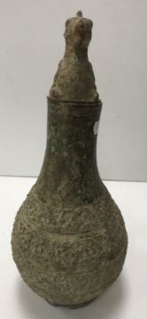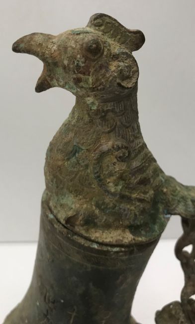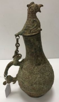 A Chinese bronze ritual vessel of lopsided teardrop form in the Han dynasty or warring states manner set with nine character marks to each side and bands of scrolling decoration, the handle in the form of a lizard type monster and the lid as a bird's head 29.5 cm high