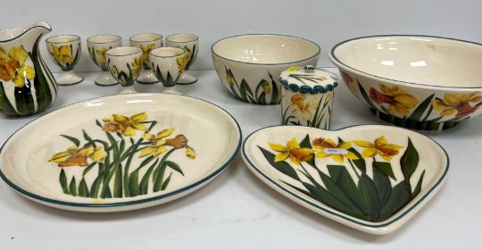 A collection of Griselda Hill Pottery Wemyss ware daffodil pattern including six egg cups, conserve pot, cream jug, love heart shaped dish, two bowls and a circular dish