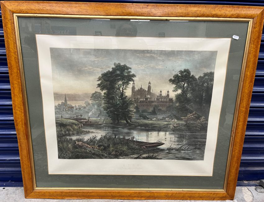 AFTER R GALLON "Eton from the Thames" coloured engraving by S.A. Edwards 61 cm x 77 cm, AFTER LIONEL EDWARDS "The Old Surrey and Burstow Fox Hounds at Burstow" colour print 38 cm x 52 cm, R. STUBBINGS "Market town street scene" pastel study, signed and dated '46 lower right 29.5 cm x 46.5 cm and AFTER JEAN FREDERIC SCHALL "Lover surprised" coloured engraving 46.5 cm x 37 cm (4)