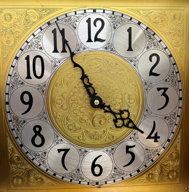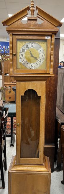 A modern light oak cased long case clock, the Western German movement with square brass dial and silvered chapter ring with Arabic numerals 42 cm wide x 185 cm high