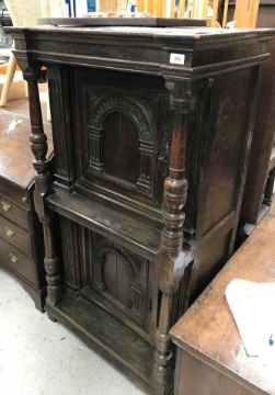 A late 17th Century oak cupboard of small proportions, the upper section with moulded cornice over an arched panelled door enclosing a recess over a matching panelled door, flanked by turned and ringed side columns with cup and cover embellishments, raised on stile supports, 75 cm wide x 52 cm deep x 134 cm high
