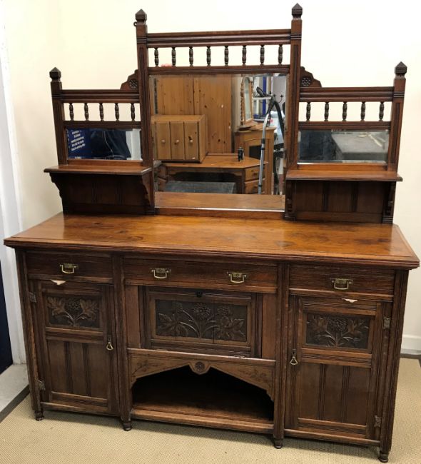 A Victorian Aesthetic oak sideboard, the mirrored and shelved back over a central drawer and fall front compartment with stylised carved sunflower decorated panel and dog kennel flanked by two further drawers and sunflower carved panelled doors on turned feet, 183 cm wide x 57 cm deep x 194 cm high
