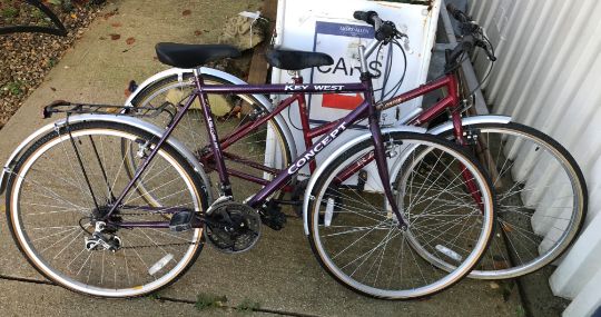 A Concept Key West 15 speed grip shift bicycle together with a Raleigh Pioneer Classic 5 speed bicycle